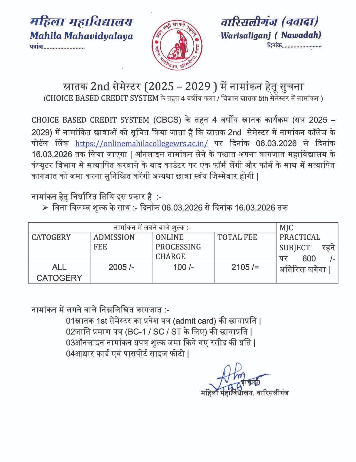NOTICE REGARDING DEGREE 2ND SEMESTER (2025-29) ADMISSION